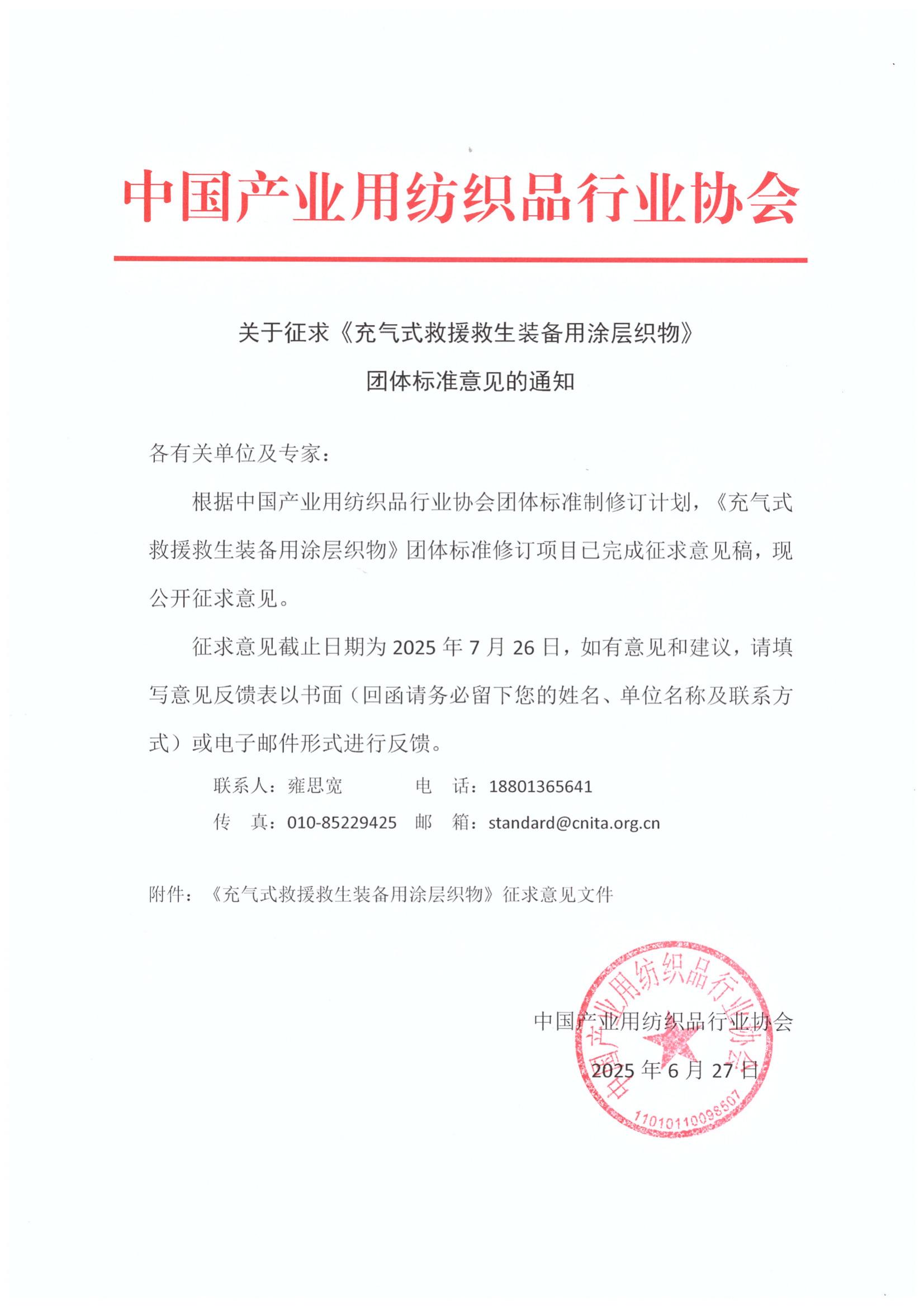 關于征求《充氣式救援救生裝備用涂層織物》團體標準意見的通知