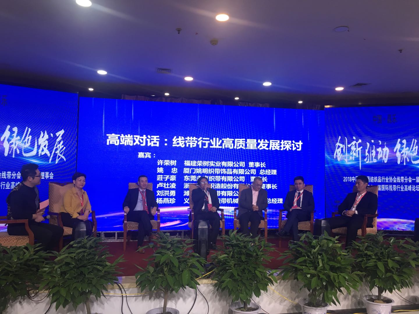 在“線帶行業(yè)高質(zhì)量發(fā)展探討”環(huán)節(jié),邀請(qǐng)到福建榮樹實(shí)業(yè)有限公司董事長(zhǎng)許榮樹、廈門姚明織帶飾品有限公司總經(jīng)理姚忠、東莞永亨織帶有限公司董事長(zhǎng)莊子豪、浙江澳亞織造股份有限公司董事長(zhǎng)盧壯凌、濰坊豐源織帶有限公司總經(jīng)理劉洪勇、義烏市迪隆織帶有限公司總經(jīng)理?xiàng)钛嗾湫袠I(yè)內(nèi)六位精英從織帶加工質(zhì)量提升、海外市場(chǎng)拓展和設(shè)廠經(jīng)驗(yàn)分享、新產(chǎn)品開發(fā)、企業(yè)管理、生產(chǎn)智能化等方面進(jìn)行互動(dòng)和探討。
