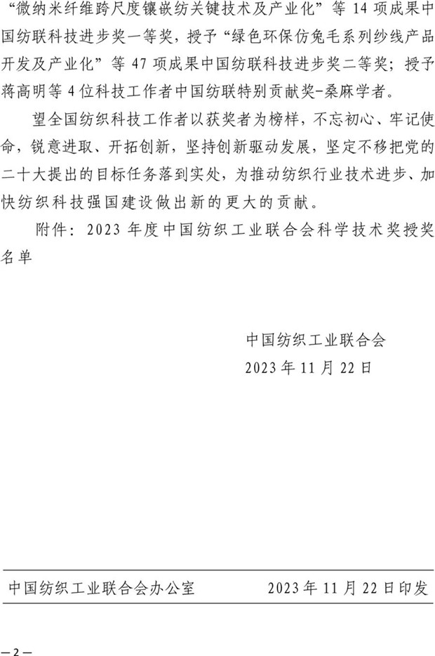 “科技創(chuàng)新是行業(yè)高質(zhì)量發(fā)展的驅(qū)動力,大會的召開將進(jìn)一步引領(lǐng)紡織行業(yè)的高質(zhì)量發(fā)展,助力紡織科技強(qiáng)國建設(shè)。”12月6日,2023年度中國紡織工業(yè)聯(lián)合會科學(xué)技術(shù)獎勵大會在人民大會堂隆重召開。
