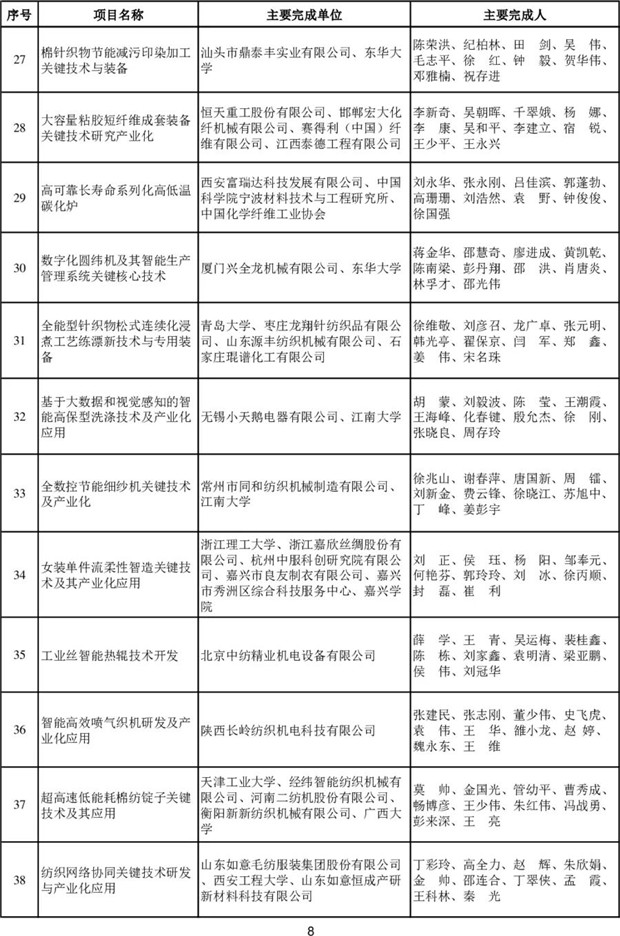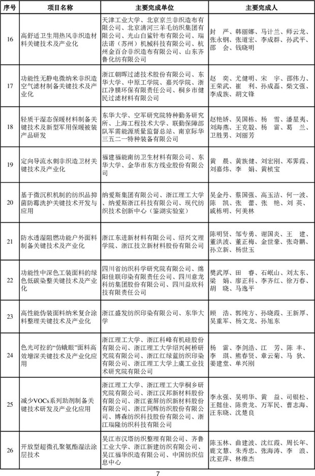 大會表彰了為我國紡織科技事業(yè)發(fā)展作出突出貢獻(xiàn)的科技工作者。其中,技術(shù)發(fā)明和科技進(jìn)步獎67項,特別貢獻(xiàn)獎-桑麻學(xué)者4人。產(chǎn)業(yè)用紡織品領(lǐng)域共有18項成果獲獎,技術(shù)發(fā)明一等獎1項,二等獎2項,科技進(jìn)步一等獎4項,二等獎11項(名單附后)。