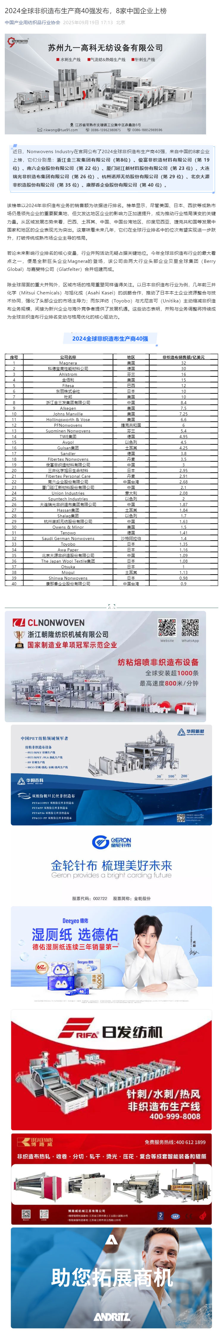 2024全球非織造布生產(chǎn)商40強(qiáng)發(fā)布,8家中國(guó)企業(yè)上榜