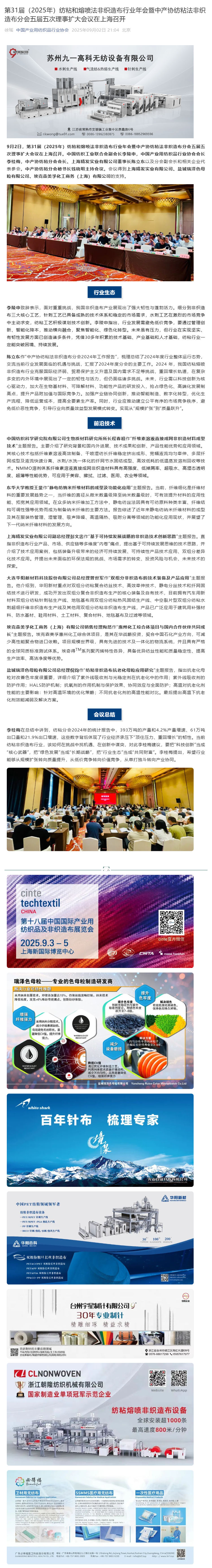 第31屆(2025年)紡粘和熔噴法非織造布行業(yè)年會暨中產(chǎn)協(xié)紡粘法非織造布分會五屆五次理事擴大會議在上海召開